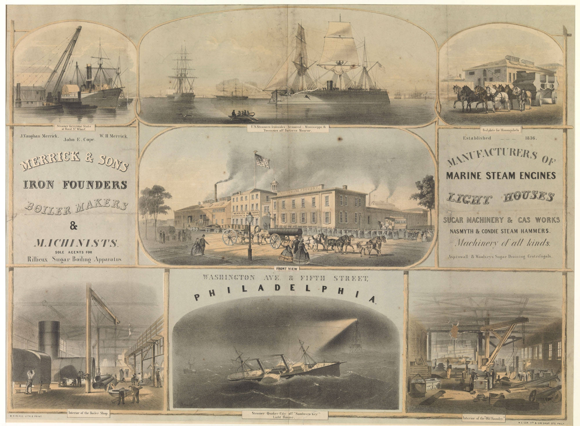 A photograph of USS New Ironsides, a masted steamer frigate, built in Philadelphia in 1862 by Merrick & Sons. Their foundry was at Fifth Street and Washington Avenue. This was the first seagoing ironclad in the US Navy, and though it was a year or so behind Britain's HMS Warrior (video), it can be regarded as predecessor to US battleships of the recent 20th century era and perhaps of the modern day missile frigates, it being, after all, itself a frigate.